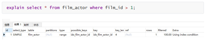复制explain select * from film_actor where film_id > 1;1.