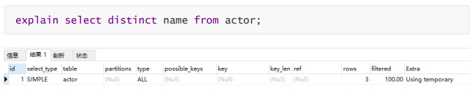 复制explain select distinct name from actor;1.