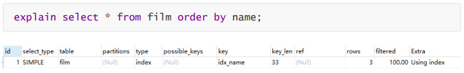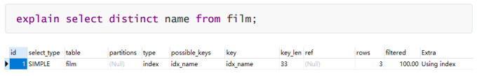 (2)film.name建立了idx_name索引,此时查询时extra是using index,没有用临时表。