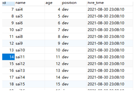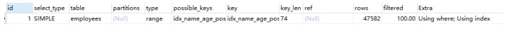 复制 explain SELECT id,`name`,age,position FROM `employees` where `name` like "sai%" and age = 22 and position = dev;-- 耗时 0.051sSELECT id,`name`,age,position FROM `employees` where `name` like "sai%" and age = 22 and position = dev;1.2.3.4.