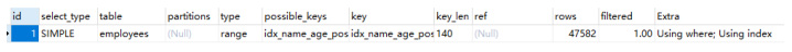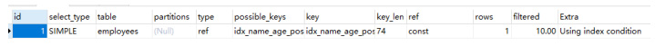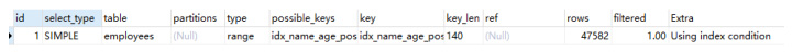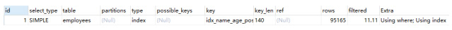 复制explain SELECT * FROM `employees` force index(idx_name_age_position) where `name` like "sai%" and age = 22 and position = dev;1.