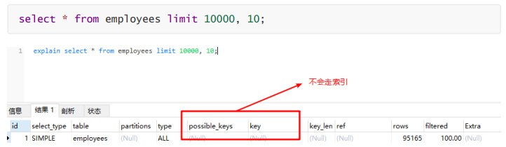 复制explain select * from employees where id > 10000 limit 10;1.