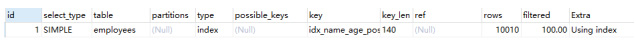 复制 -- 0.085sselect * from employees order by `name` desc limit 10000, 10;1.2. 首先想到覆盖索引优化,看看能否这样干 复制 explain select `name`, age, position from employees order by `name` desc limit 10000, 10;-- 0.077sselect `name`, age, position from employees order by `name` desc limit 10000, 10;1.2.3.4.