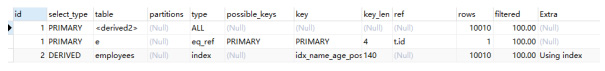 复制explain select e.* from employees e inner join (select id from employees order by `name` desc limit 10000, 10) t on t.id = e.id;-- 0.045sselect e.* from employees e inner join (select id from employees order by `name` desc limit 10000, 10) t on t.id = e.id;1.2.3.4.