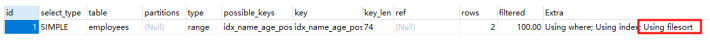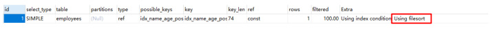 MySQL 支持两种排序方式 filesort 和 index, Using index 是扫描索引完成的排序,而 Using filesort 是利用内存甚至磁盘完成排序的。因此,index 效率高,filesort 效率低。