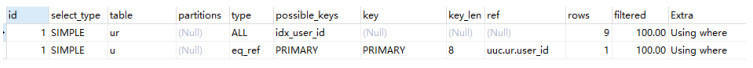 uuc_user_role 是驱动表,并且扫描了9条记录(表里只有9条记录),然后通过 user_id 去关联了 uuc_user(被驱动表)。注意:优化器一般会优先选择小表驱动大表,我们 SQL 写的表的先后顺序有可能会被优化。