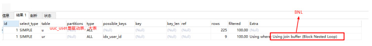 NLJ这个过程会读取 ur 所有数据(9行记录),每次读一行并拿到 user_id 的值,然后得到对应的 uuc_user 里的记录(这就是又扫了一次索引得到一行数据)。也就是说,整个过程扫描了18行记录。注意:如果被驱动表的关联字段没有索引,使用NLJ算法性能较低,MySQL会选择使用 BNL 算法。