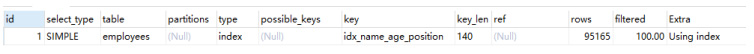 复制 -- 我们常认为 like 以通配符开头,索引会失效,但其实也可以通过覆盖索引,让索引生效。explain select `name`, age, position from employees where `name` like %sai%;1.2.