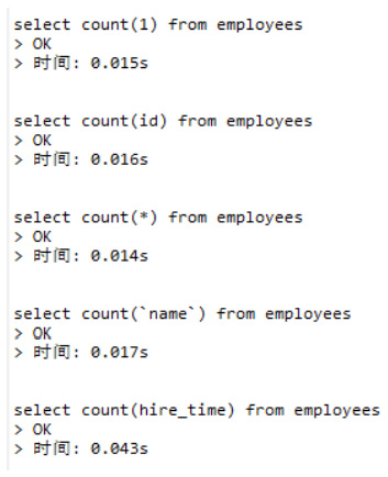 复制-- 临时关闭查询缓存,看实验的真实时间set global query_cache_size=0;set global query_cache_type=0;-- 首先下面四条语句得到的执行计划都是一样的,说明理论上这四个SQL的执行效率应该是差不多的explain select count(1) from employees; -- 有时0.03左右,有时0.015s左右explain select count(id) from employees;-- 稳定在0.015s左右explain select count(*) from employees;-- 稳定在0.015s左右explain select count(`name`) from employees;-- 稳定在0.015s左右1.2.3.4.5.6.7.8.