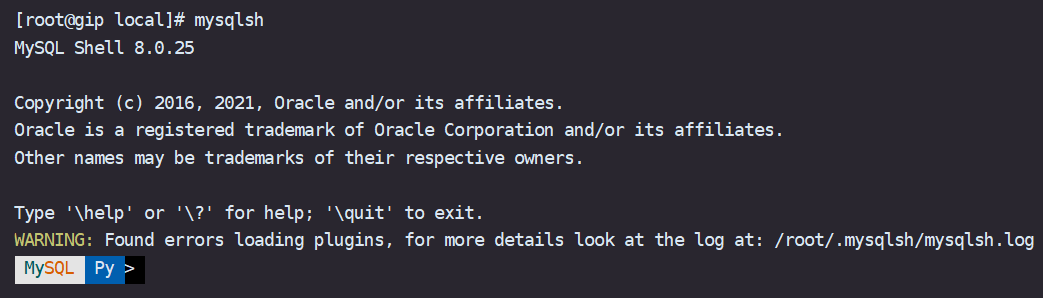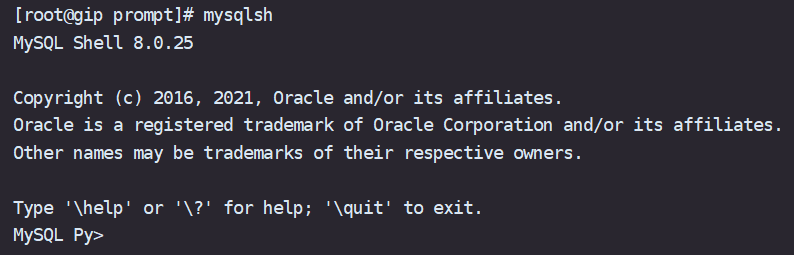 复制$ export MYSQLSH_PROMPT_THEME=/usr/local/GreatSQLshell/greatsql-shell-8.0.25-16-Linux-glibc2.17-x86_64/share/mysqlsh/prompt/prompt_16.json1.再进入 MySQL Shell for GreatSQL 看看已经变了个样子