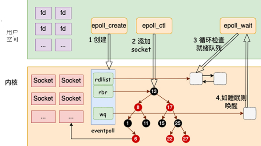 复制int main(){ lfd = socket(AF_INET,SOCK_STREAM,0); // 创建socket bind(lfd, ...); // 绑定IP地址与端口 listen(lfd, ...); // 监听 // 创建epoll对象 efd = epoll_create(...); // 把 listen socket 的事件管理起来 epoll_ctl(efd, EPOLL_CTL_ADD, lfd, ...); //事件循环 for (;;) { size_t nready = epoll_wait(efd, ep, ...); for (int i = 0; i < nready; ++i){ if(ep[i].data.fd == lfd){ fd = accept(listenfd, ...); //lfd上发生事件表示都连接到达,accept接收它 epoll_ctl(efd, EPOLL_CTL_ADD, fd, ...); }else{ //其它socket发生的事件都是读写请求、或者关闭连接 ... } } } }1.2.3.4.5.6.7.8.9.10.11.12.13.14.15.16.17.18.19.20.21.22.23.24.25.