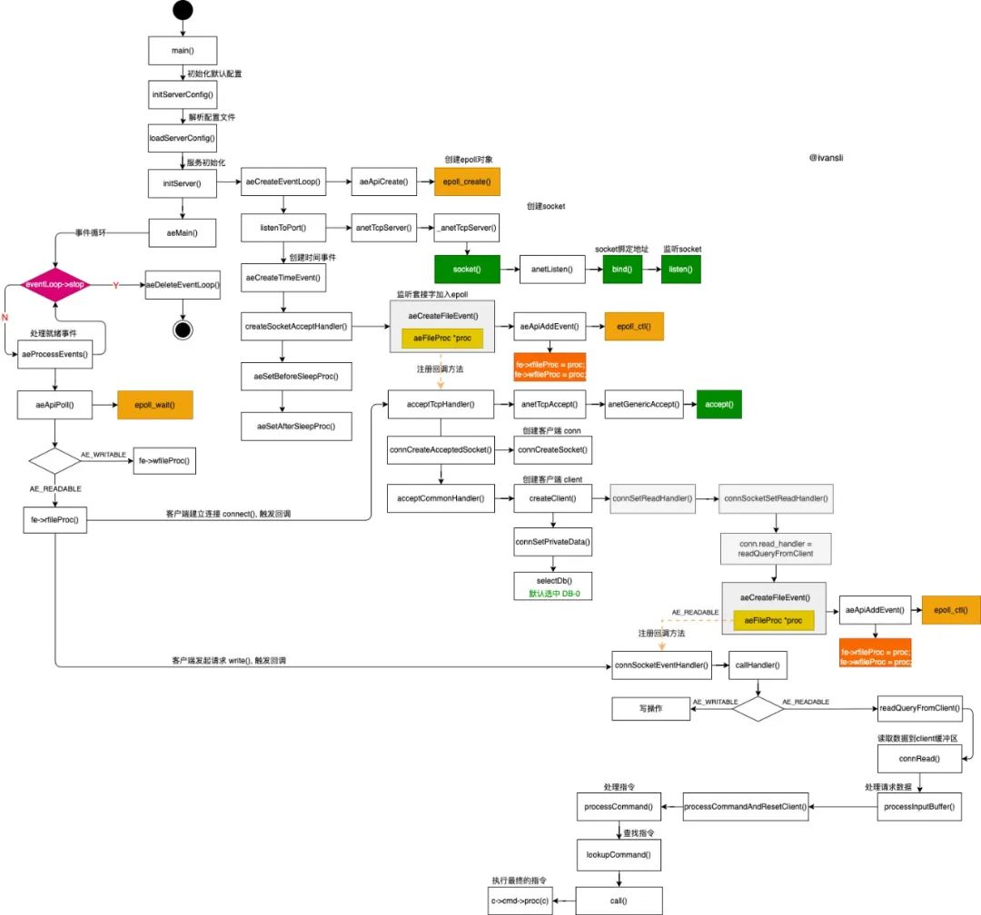 从上可知,Redis作为Server服务端在启动之后随时随刻监听着相关事件的发生。以linux为例,其处理过程与基于epoll的i/o多路复用伪代码框架基本相似,Redis源码中更多的是通过封装使其得到一个方便使用的库,库的底层包含了多种i/o多路复用实现方式。
