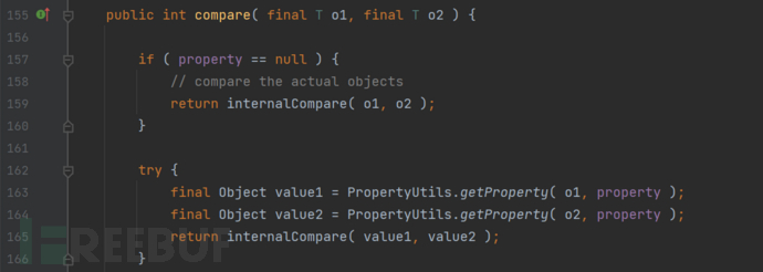 在方法中,将会通过调用PropertyUtils.getProperty将会取出两个对象的property属性值,之后调用internalCompare通过在创建BeanComparator对象是创建的比较器。