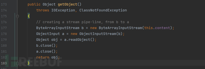 同样可以通过二次反序列化的方式触发利用链,在SignedObject#getObject方法中。