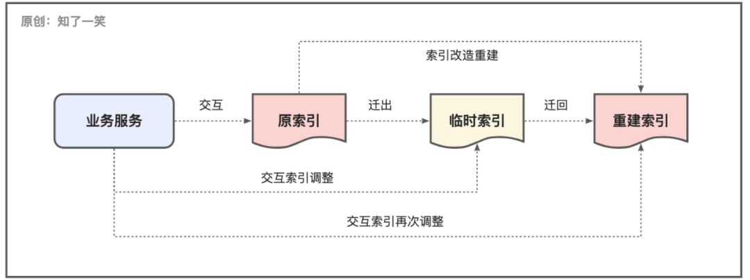 ES实践中一个非常经典的问题,修改索引的结构时需要进行索引重建,此时要将当前索引迁入临时索引中,在完成索引结构调整之后,需要从临时索引中迁回数据,在此过程中,可以对服务交互的索引名称动态调整;