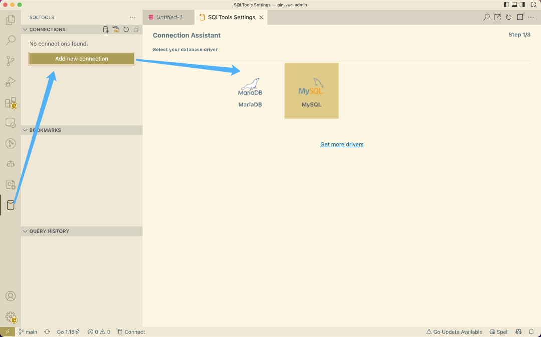 点击 Add new connection 按钮新增一个数据库连接,然后会在右侧打开 SQLTools Settings 页面选择需要管理的数据库驱动,我们这里安装的是 MySQL/MariaDB 的驱动,所以只显示这两个驱动选项。