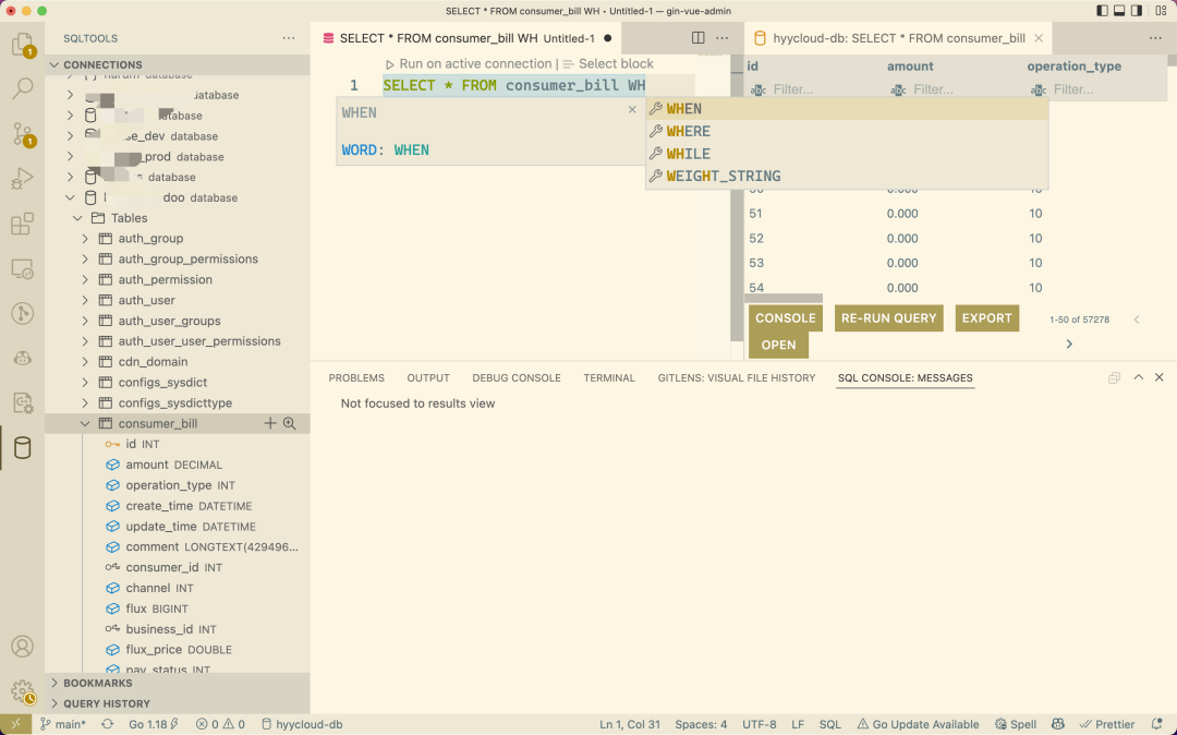 配置完成后点击 SAVE CONNECTION 保存连接即可,企商汇连接完成后即可在 VSCode 中看到当前连接下的所有数据库列表,我们可以在具体的 Table 上做一些操作,点击上面的 sql 图标可以进行 SQL 查询,而且是支持 SQL 语句智能提示的,执行后的结果默认会在右侧显示出来: