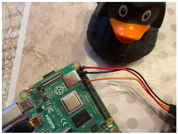在本例中,我们使用一根黑线将传感器的地线,连接到电路板的地线(PIN 6)上,一根红线连接到+5V(PIN 2)上,并将信号线连接到其中一个GPIO(PIN 11)上。下面的两张图像展示了组装的效果,当然,如果您不知道哪根线缆应当对应哪里的话,请取下传感器上的盖子,并仔细检查PCB上的标签。