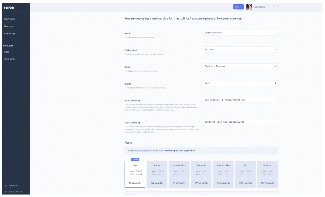 名称:可自由选择环境:Python 3地区:选择离您最近的一个分支:main构建命令 pip install -r requirements.txt启动命令gunicorn main:app