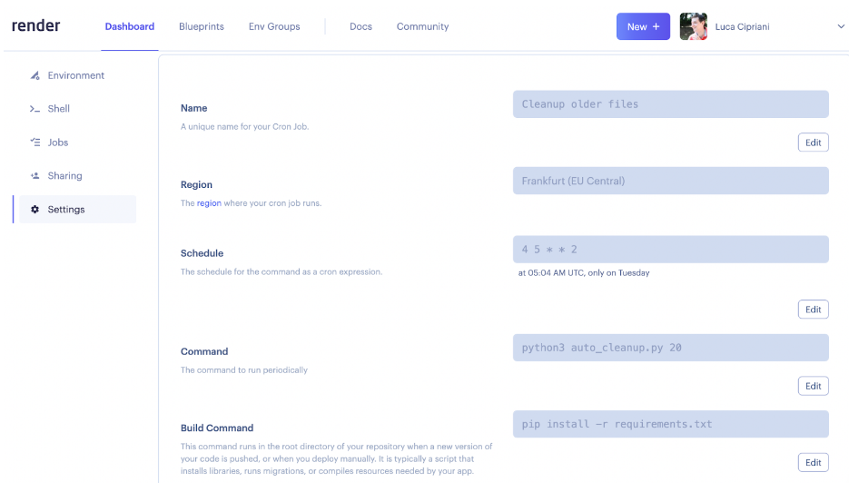 接着,我在Render的仪表板中创建了一个新的Cronjob服务。