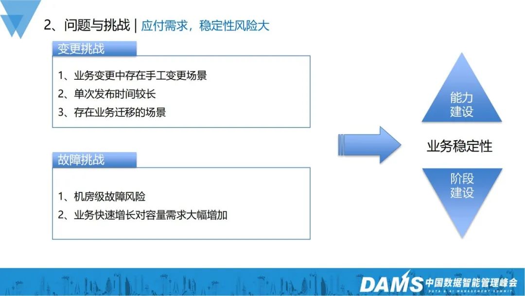 2、故障挑战机房级故障风险(大小公司都会遇到,光纤挖断或机房内部故障等);业务快速增长对容量需求大幅增加。在此挑战下,我们分为了可用性能力和可用性阶段两个维度去建设,以此保障业务的稳定性。