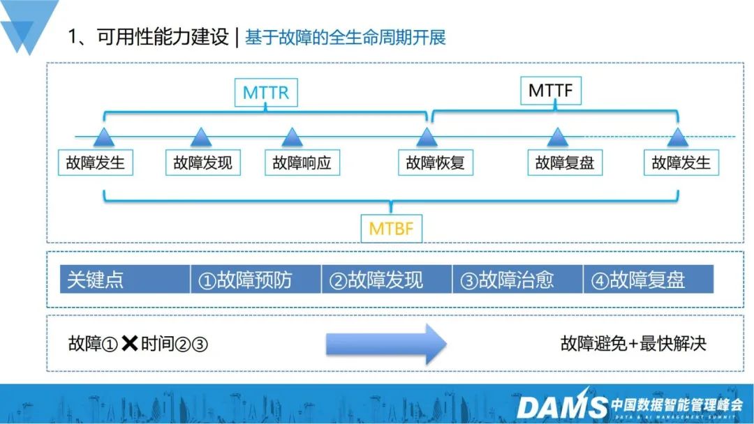 我们的可用性的能力建设是基于故障的全生命周期去开展的,从故障发生、发现、响应、恢复、复盘到再次发生。从故障发生到恢复的时间,称为MTTR;从故障的恢复到发生,从稳定到不稳定,称为MTTF;故障发生的间隔时间,称为MTBF,总计3个指标。