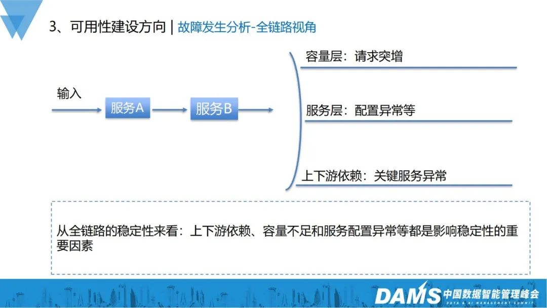 从全链路的稳定性来看:上下游的依赖、容量不足和服务配置异常等,都是影响稳定性的重要因素。