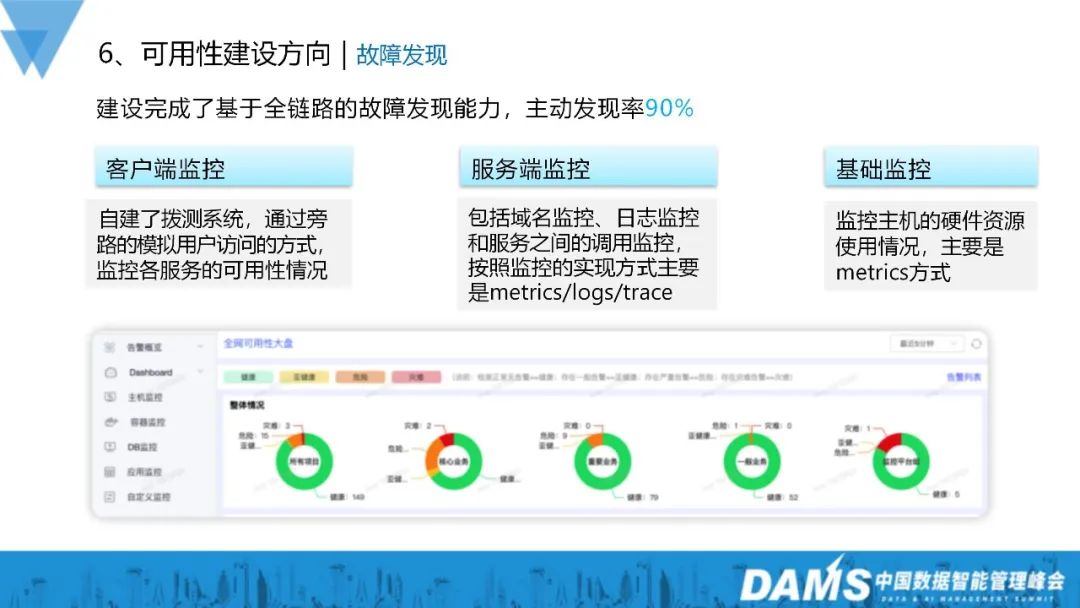 我们建设了基于全链路的故障发现能力,目到故障主动发现率能达到90%,这当中包括客户端监控、服务端监控和基础监控: