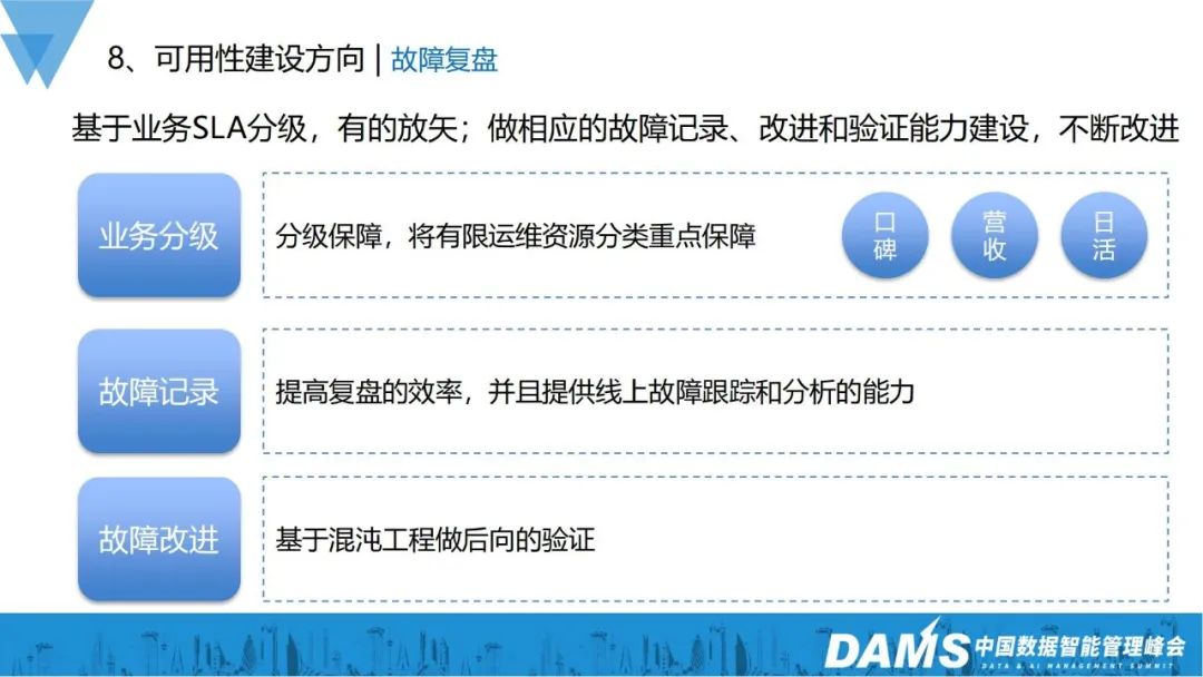 我们通过基于业务的SLA分级,有的放矢地去保证业务的稳定性,并做好业务的每一个故障记录,改进和验证能力建设: