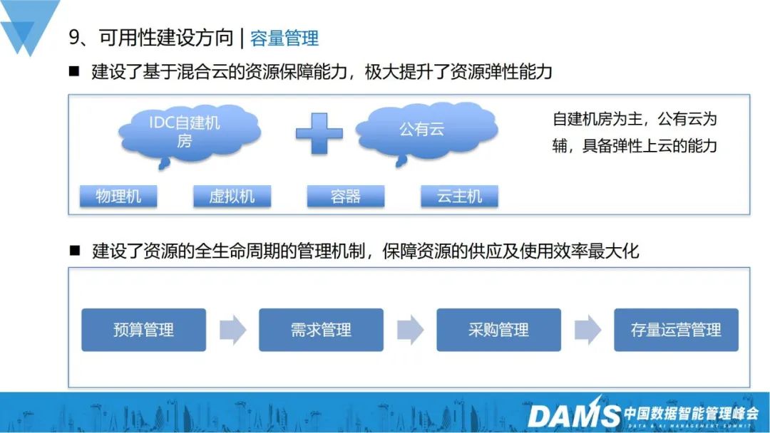 资源弹性伸缩能力:建设基于混合云的资源保障能力,极大提升资源弹性能力;资源交付运营管理能力:建设资源的全生命周期的管理机制,保证资源的供应跟使用效率最大化,实现了包括预算管理、需求管理、采购管理、存量运营管理。三、可用性阶段建设