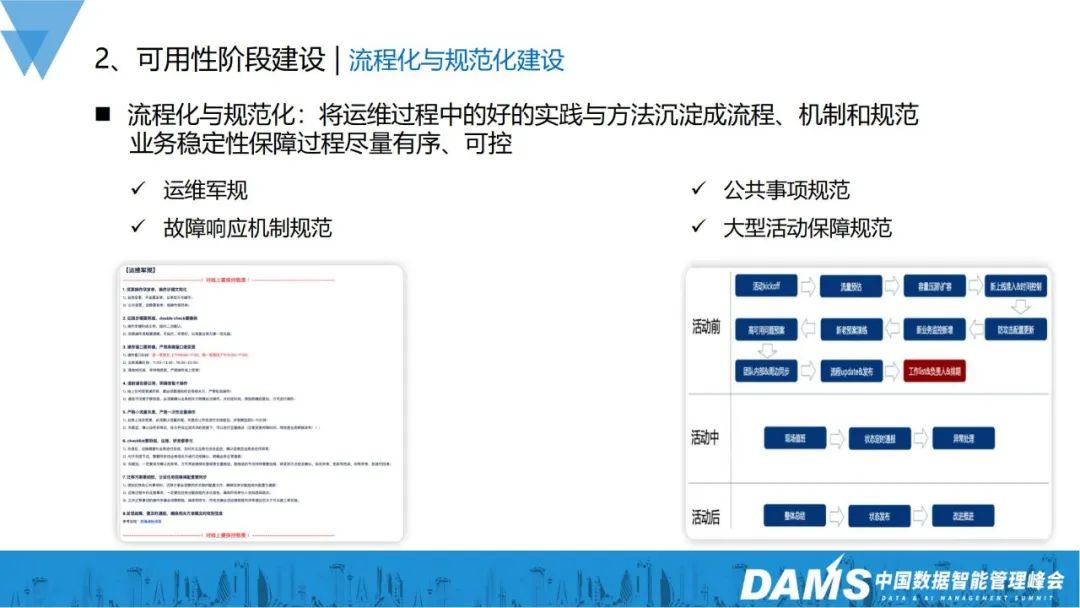 首先,我们会将运维过程中做得比较好的实践和方法沉淀成流程机制和规范,让业务稳定性保障有序可控,包括运维军规、故障响应机制、公共事项规范、大型活动保障规范等。