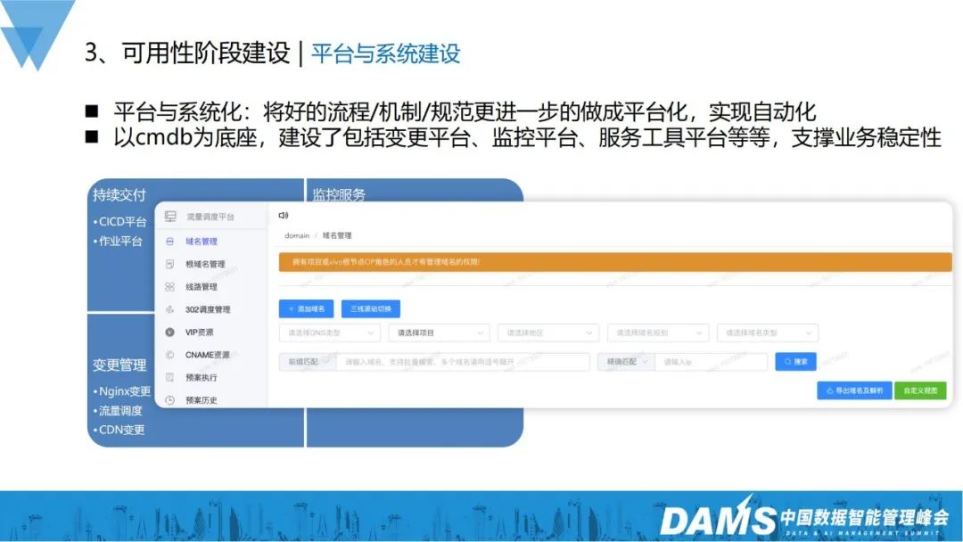 在平台与系统建设上,以CMDB为底座,把往常较好的流程机制更进一步做成平台,如变更平台、监控平台、服务工具平台等,以此支撑业务稳定性。