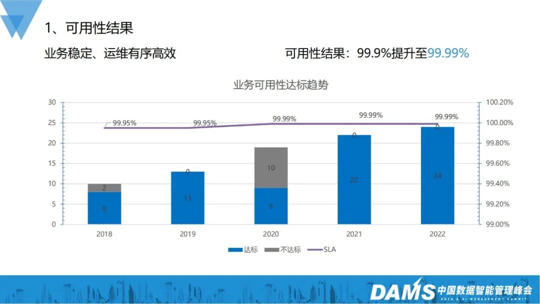 到2022年,整体业务稳定性运维实现有序高效,业务可用性从之前的3个9提升到现在4个9,达标的业务个数也从之前的8个到现在的24个。