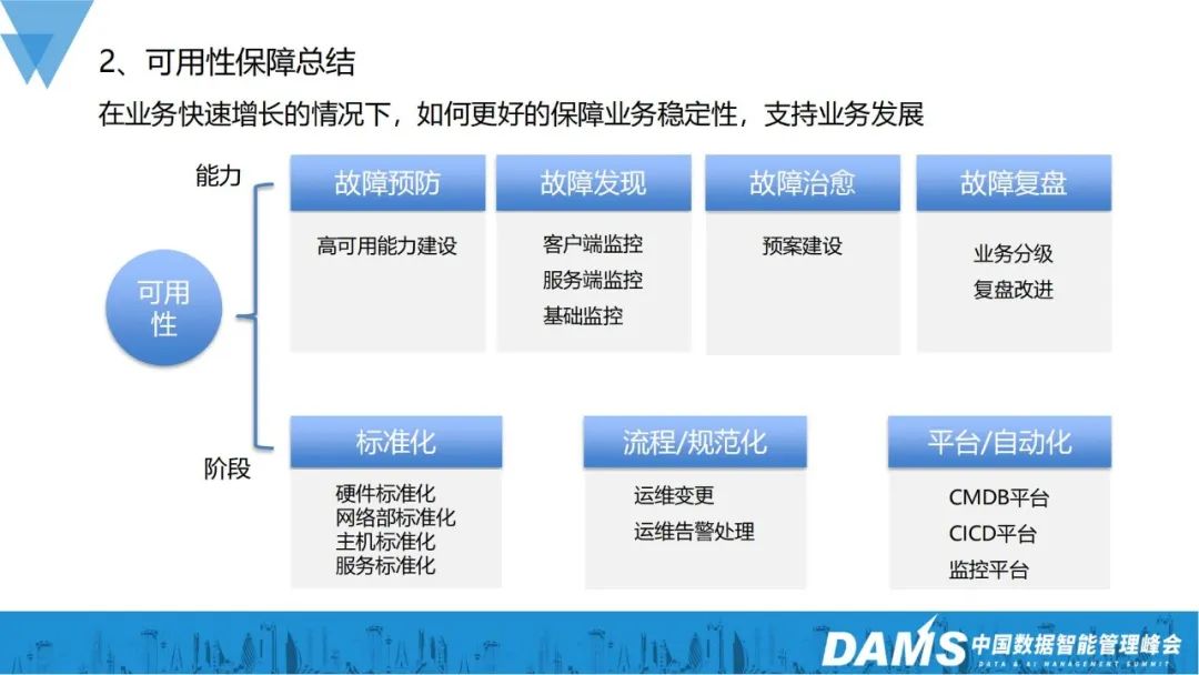 可用性能力建设:故障预防、故障发现、故障治愈、故障复盘可用性阶段建设:标准化、流程/规范化、平台/自动化