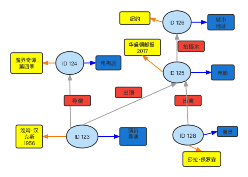其中浅蓝色椭圆表示节点,深蓝色框表示节点的标签,黄色框表示属性,红色方框表示边的类型。