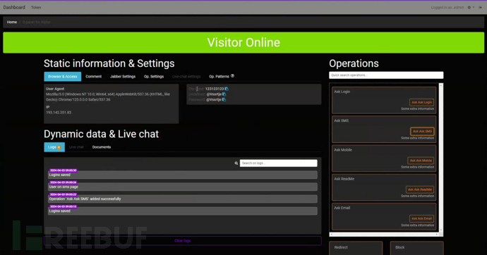 此外,管理面板(uPanel)允许欺诈者通过聊天系统与受害者实时互动,通过发送自定义通知获取一次性密码(OTP)。