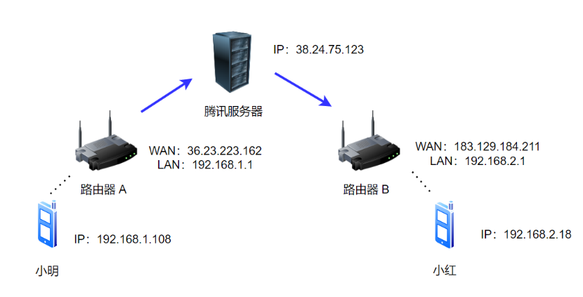 而腾讯服务器由于有自己的公网地址,因此小明和小红都可以通过这个公网地址都可以找到腾讯服务器,然后通过腾讯服务器这个中介,小明和小红就可以通信了。