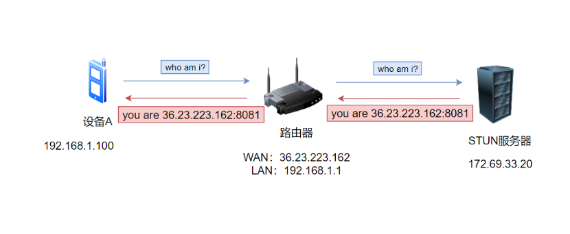 STUN协议如图5所示:设备通过给公网的STUN服务器发送请求获得自己的公网地址信息。类似的,像这种通过某种协议或者方式让路由器留下一个内外网映射的“洞口”,通常称为:“打洞”。而外网主机如果可以通过这个“洞口”与内网主机通信,则说明“打洞成功”。
