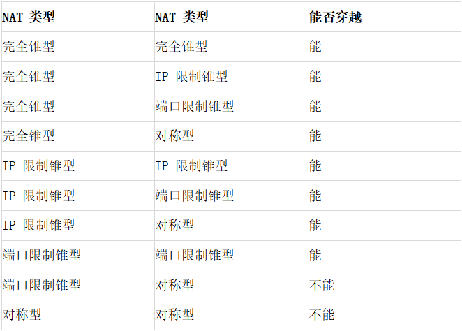 完全锥型IP 限制锥型端口限制锥型对称型这4种类型中,越往后的NAT类型穿越难度越大。