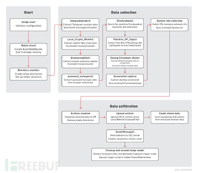 Water Gamayun的攻击武器库不仅包含Rhadamanthys,还被发现投放另一款商业化窃密程序StealC,以及三款定制化PowerShell变体(分别称为EncryptHub窃密程序变体A、B和C)。这款定制窃密程序功能全面,可收集包括杀毒软件详情、已安装程序、网络适配器和运行中应用在内的系统信息,还能窃取Wi-Fi密码、Windows产品密钥、剪贴板历史记录、浏览器凭据,b2b信息网以及来自消息应用、VPN、FTP和密码管理工具等各类应用的会话数据。