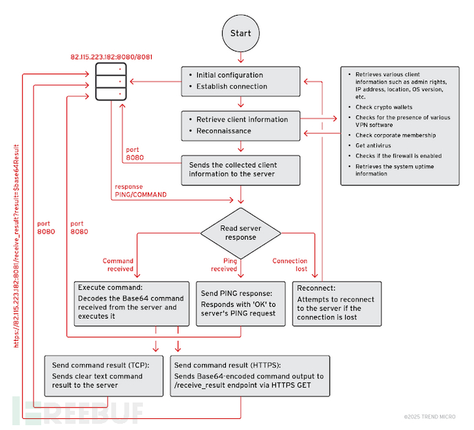 研究人员表示:"恶意软件将侦察到的系统信息外泄至C&C服务器后,会进入持续循环等待命令状态。它通过8080端口的TCP连接接收命令,命令格式为COMMAND|<base64编码命令>。主通信循环确保与服务器持续交互,处理命令、维持连接并安全传输结果。"