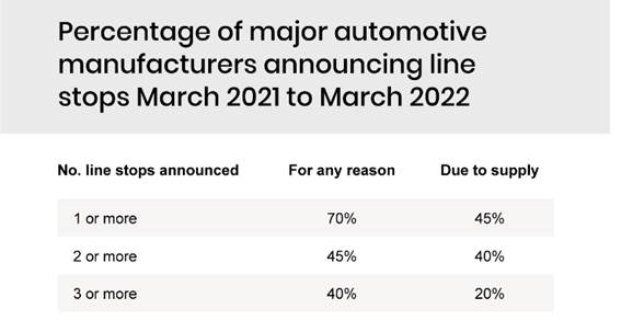 全球主要汽车制造商中,有45%在去年因供应链短缺而宣布停产全球主要汽车制造商中,有70%在过去一年中曾宣布暂停生产线,其中45%特别提到了供应链短缺问题。在总部位于欧洲和美国的企业中,这个比例甚至更高——这些地区60%的主要汽车制造商在过去12个月中曾宣布因供应短缺问题而关闭工厂。
