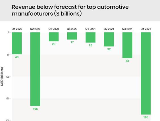 因此,汽车制造商在2021年损失了超过3000亿美元的收入,第四季度是过去十年以来最糟糕的季度。与疫情前的预测相比,汽车制造商的销售额减少了超过1860亿美元。