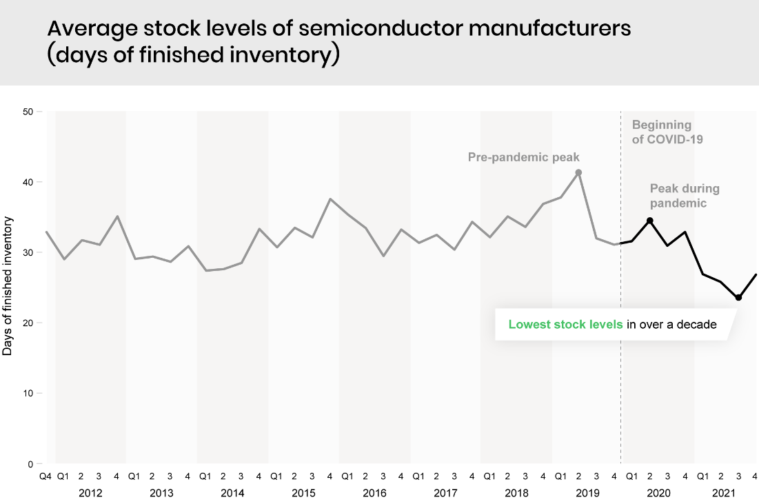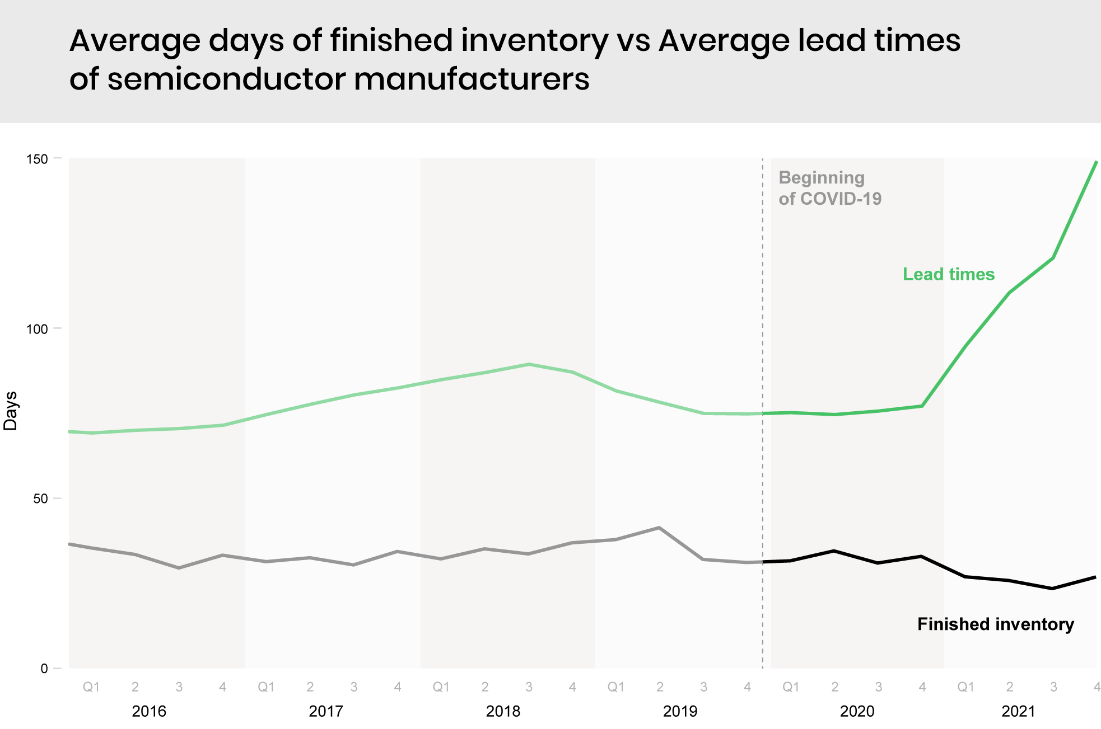 芯片制造商的库存天数减少到23天,但交货时间延长到了150天以上在2021年,随着半导体需求的增加,整个供应链上制造商的产能无法跟上,而且他们的库存水平下降、交货期延长,导致汽车生产线暂停生产,使得许多汽车制造商无法完成订单。