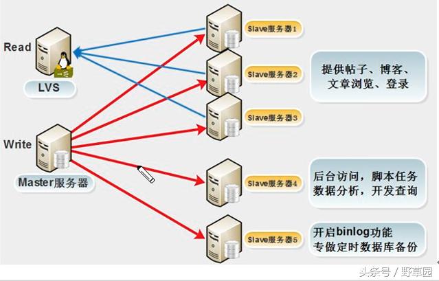可以把几个不同的从服务器,根据公司的云南idc服务商业务进行拆分。例如:有为外部用户提供查询服务的从服务器,有内部DBA用来数据备份的从服务器,还有为公司内部人员提供访问的后台、脚本、日志分析及供开发人员查询使用的从服务器。这样的拆分除了减轻主服务器的压力外,还可以使数据库对外部用户浏览、内部用户业务处理及DBA人员的备份等互不影响。具体可以用下图说明: