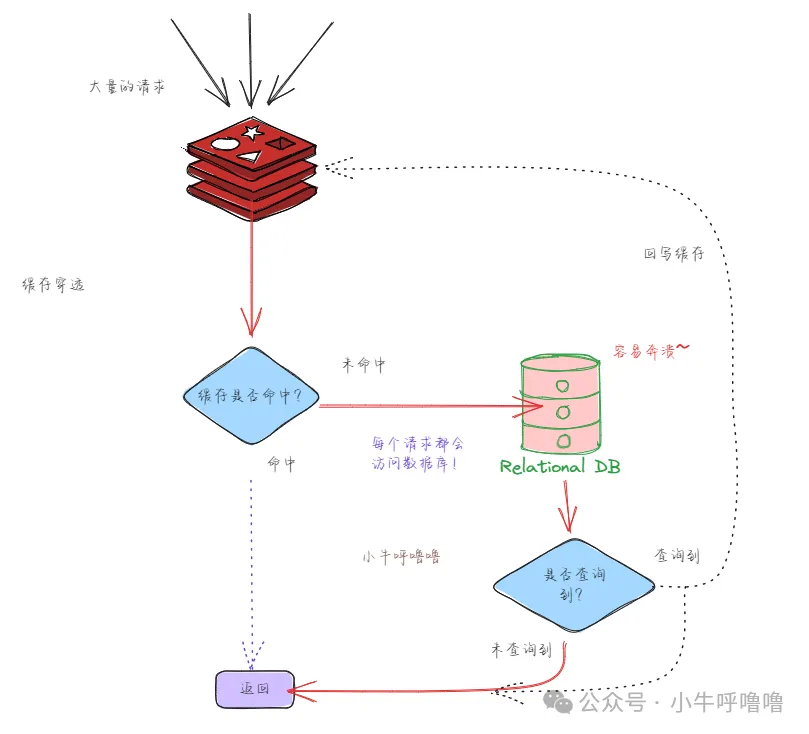 缓存穿透: 当请求过来,访问不存在的数据时(即既不在缓存中,也不在数据库中),这会导致访问缓存,未命中,继续访问数据库db,然后发现在数据库中还是未查询到数据,这个时候也就不能回写缓存,来为后续的请求服务;也就是说,当这种请求过来,每次都会去查数据库,缓存形同虚设,一旦流量暴增,容易直接带崩数据库